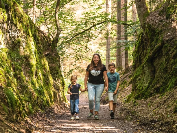 Vom Tierpark Niederfischbach führt ein uriger, tief in Felsformationen eingeschnittener Weg auf der schmalen Trasse einer ehemaligen Grubenbahn zum Gelände eines früheren Bergwerks. Am Wegesrand erzählen Infostationen vom Leben der Eichhörnchen – spannende Rätsel und Aufgaben animieren Kinder zum Mitmachen.