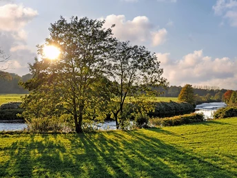 Die moderate Tour startet mitten in Hennef: Nach einer kurzen Passage durchs beschauliche Kleinstadtzentrum erreicht ihr den langgezogenen Bogen des Siegdamms, der entlang alter Linden durch eine friedliche Auenlandschaft führt. Zwischen Weingartsgasse und Seligenthal sind an der Sieg die Relikte der „Grube Ziethen“ zu sehen, in der man einst nach Bleierz grub. Bergauf führt euch ein Feldweg mit Landschaftspanorama oberhalb der verwilderten ehemaligen Weinbergterrassen zu einem höher gelegenen Rastplatz. Dort genießt ihr eine fantastische Aussicht und erhaltet interessante Informationen zur Siedlungsgeschichte zwischen Rhein und Sieg. Weiter führt ein Serpentinenpfad steil bergab in ein kleines bewaldetes Bachtal. Weiter geht’s erst steil, dann gemäßigter auf der anderen Talseite bergauf, wo bald der Kirchturm des hübschen Dörfchens Happerschoß in Sichtweite gerät. Ein Feldweg führt auf dem Mühlenberg zwischen Äckern und Wiesen hindurch, auf der einsamen Höhe erhaltet ihr überraschende Einblicke in die historische Kulturlandschaft. Im Anschluss führt euch die Route erneut ein Stück hinab in ein Kerbtal. Auf teils steilen Pfaden geht es am Rande des Örtchens Allner vorbei an den mächtigen Mauern einer einstigen Wasserburg und den Überresten einer Getreide- und Ölmühle am Siegufer. Entlang der Sieg und durch die Auen gelangt ihr zurück zum Bahnhof Hennef.