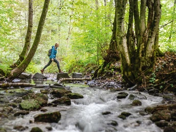 Zum Warmlaufen nutzt du den Zuweg am Bahndamm und eroberst beim Museumsdorf in Altwindeck auf einem steilen Pfad die Burgruine – diese war jahrhundertelang ein strategischer Stützpunkt der Grafschaft Berg. Heute beeindruckt die Burganlage mit einem Panorama im Wideformat. Durch einen Hohlweg gelangst du in einen stillen Bergwald. Steil hinunter, über Trittsteine durch den Westertbach und noch zwei Anstiege, dann erreichst du im Rosbachtal die Bachmühle mit Einkehrmöglichkeit. Ein spannender Trampelpfad, der immer steiler und felsiger wird, führt zum Aussichtspunkt Alter Stuhl. Mit knapp 280 m Höhe ist der Aufstieg zwar keine alpine Herausforderung, die Aussicht dennoch außergewöhnlich und lohnenswert. Satt gesehen geht es runter ins Burgbachtal und später durch den Auer Wald mit ziemlich alten Eichenriesen, bevor das Etappenende, der Bahnhof in Au erreicht ist.