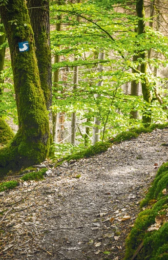 Vom Bahnhof Wissen führt der Zuweg an der Sieg entlang zum Hauptweg. Der Natursteig wechselt auf die rechte Seite des Flusses. Der Auftakt ist steil, hinauf nach Schönstein und ins verwinkelte Tal des Firzelbaches. Stetig bergan eröffnet sich bei Blickhausen euer erster schöner Blick auf die umliegenden Höhen, wenig später entdeckt ihr ein Fenster in vergangene Zeiten: Ein Ausblick über die Halde der Grube Rasselskaute samt Infotafel lehrt über die Bergbautradition der Region. Auf und ab geht es weiter in Richtung Campingplatz, unterwegs überwindet ihr eine seilgesicherte Steilpassage. Durch das schöne Osenbacher Seifental erreicht diese Etappe die Sieg, direkt am steilen Ufer entlang windet sich ein schmaler Trampelpfad, ehe es steil hinauf zum Aussichtsfelsen „Steckensteiner Kopf“ über der Siegschleife geht. Erst unten, dann oben – ein toller Kontrast. Es folgen immer wieder schöne Blicke ins wellige Hinterland in Richtung Mittelhof. Vorbei am Mobilheimpark führt euch ein schwungvoller Pfad durch dichten Wald hinab nach Scheuerfeld, das immer mal wieder durch die Blätter blitzt.