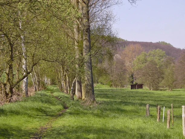 Der Eudenberg ist ein aufgelassener Steinbruch mit verschiedenen Abbauplateaus im Bereich eines ehemaligen Vulkankegels. Hier wurde vom Ende des 19. Jh. bis 1967 Basalt abgebaut und mit einem eigenen Anschluss an die im Tal liegende ehemalige Bahnstrecke Hennef - Asbach per Bahn abtransportiert. Während heute seine Flanken am Oberhang mit dichtem Laubmischwald bestanden sind, befinden sich an den Hangfüßen Mähwiesen und es hat sich nach Schließung des Steinhaubetriebs ein Biotop gebildet, das geschützt wird. Im tiefsten Teil des Bruches bildete sich ein Steinbruchweiher. Vergleicht man alte Bilder vom laufenden Abbruch mit dem heutigen Zustand, ist es kaum vorstellbar, welche gewaltigen Gesteinsmengen mit winzigen Güterwagen abtransportiert wurden. Heute ist der Steinbruch unzugänglich und für Besucher gesperrt und wir laufen auf unserer Wanderung auf alten Wirtschaftswegen oder im Hanfbachtal auf der alten Bahntrasse, die kaum mehr gänzlich von Asbach bis Hennef zu bemerken ist, um den alten Vulkankegel herum.