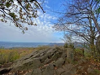 Die Aussicht vom Leyberg auf das Rheintal, das nördliche und östliche Siebengebirge, gehört zu den spektakulärsten des Siebengebirges. Der Aufstieg erfolgt auf den letzten 80 Metern über mehr oder weniger natürliche Felstreppen - Zeugen einer Basaltabbaugeschichte. Heute ist am Leyberg nur noch eine Trasse zu sehen, die am nördlichen Berghang schnurgerade durch den Wald läuft und auf Karten oder auf dem Luftbild gut zu erkennen ist. Diese Schneise ist ein Relikt aus der Zeit, als das Gestein aus den Steinbrüchen mit Hilfe von Bremsbahnen zu Tal gebracht wurde. Bremsbahnen hatten zwei parallel laufende Schienenstränge, auf denen Loren rollten. Die Loren waren so über ein Stahlseil verbunden, dass die vollen zu Tal fahrenden Loren die schon entleerten durch ihr Gewicht wieder hochzogen. Um den erheblichen Gewichtsunterschied zwischen vollen und leeren Loren auszugleichen, gab es einen Bremsapparat. Damit wurde die Ablaufgeschwindigkeit des Seils mechanisch reguliert, indem das Seil um mehrere Rollen lief. Der Bremsapparat wurde ganz in Eisen konstruiert und in die Erde eingemauert, in sogenannte Bremskeller.